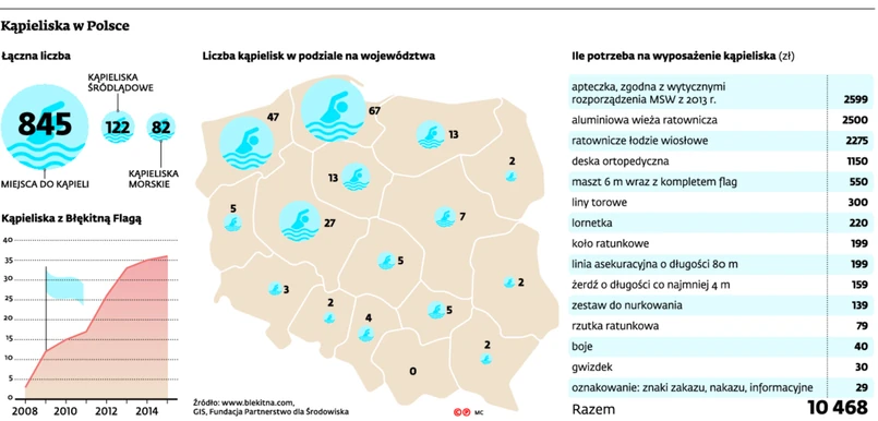 prawa na wyposażeniu muszą znaleźć się ratownicze łodzie wiosłowe – jedna na każde 100 m linii brzegowej, koło ratunkowe – jedno na każde 50 m linii brzegowej, żerdzie ratunkowe, lina asekuracyjna o długości minimum 80 m – jedna na każde 100 m linii brzegowej, gwizdek lub syrena oraz zestaw do nurkowania na każdym stanowisku ratunkowym, lornetka, maszt z kompletem flag, sprzęt medyczny – wymienia Mateusz Gąsiorek, instruktor ratownictwa wodnego, właściciel sklepu internetowego Błękitna Flaga. Koszt takiego wyposażenia to nieco ponad 10 tys. zł.