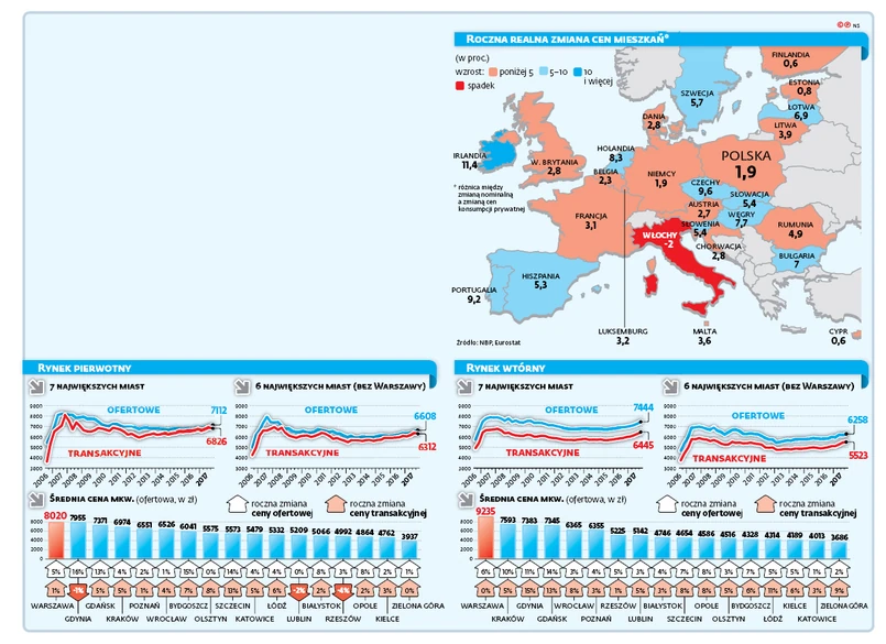 „Relacja kosztów obsługi kredytu mieszkaniowego do czynszu najmu nadal umożliwia finansowanie kosztów kredytu przychodami z najmu” – zauważa NBP. W przypadku mieszkań kupowanych z drugiej ręki wzrost cen jest jeszcze wyższy. W końcówce minionego roku sięgał 7–8 proc. w skali roku. „Wzrost cen transakcyjnych na rynku wtórnym wiązał się z dużą liczbą transakcji w lepszych lokalizacjach” – informuje bank centralny.