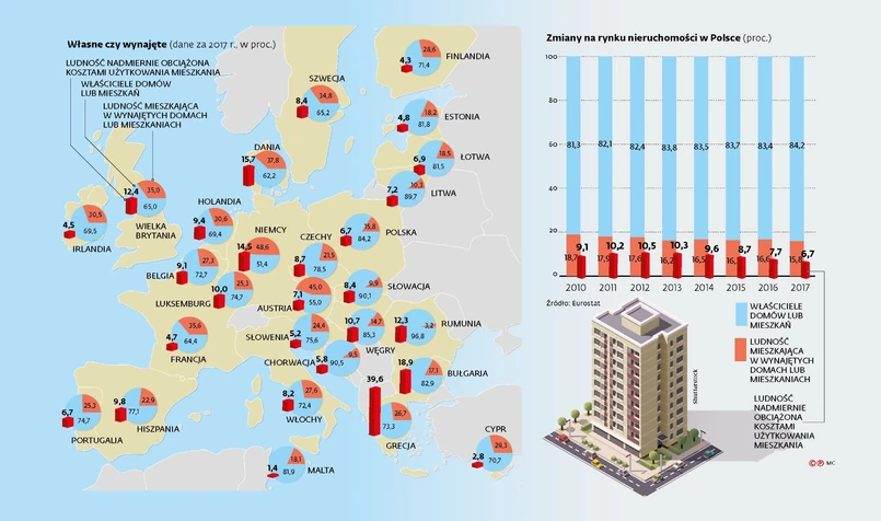 Podobnie jak w Polsce jest w krajach byłego bloku wschodniego. Inaczej jest na Zachodzie. Na przykład w Niemczech aż 49 proc. ludności wynajmuje mieszkania, w Austrii – 45 proc., w Wielkiej Brytanii i Szwecji – 35 proc.