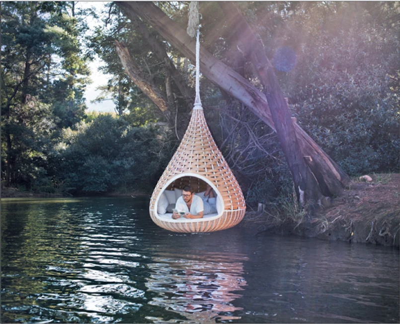 Sączące się do wnętrza przez niewielkie szczeliny promienie słońca, wygodne poduchy i miękki materac. Jakby tego było mało, przyjemne bujanie przy każdym podmuchu wiatru. Takie doznania gwarantuje nam najnowsza rodzina produktów marki Dedon. Linia Nestrest to nic innego jak olbrzymie kokony, które w swoim wnętrzu kryją prawdziwy relaks. Idealne na popołudniowe drzemki na świeżym powietrzu, medytacje czy też relaks ze znajomymi. Aluminiowy stelaż opleciony jest specjalnym włóknem. Wnętrze kokonu zaś wyściełane miękkimi tkaninami. Kto nie ma odpowiedniego drzewa, aby zawiesić na nim Nestrest, może wybrać opcję stojącą.