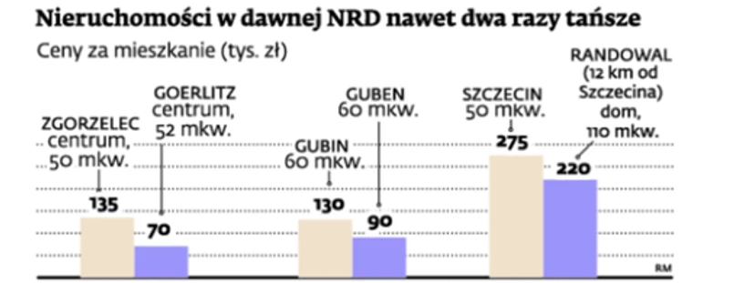 Agencja nieruchomości Kamar w Zgorzelcu, szczeciński Własny Dom w Niemczech, Pomorze Nieruchomości czy krakowski A do Z Immobilen to tylko przykłady firm, które specjalizują się w pośrednictwie sprzedaży domów i mieszkań po niemieckiej stronie granicy. Chętnych przybywa z każdym miesiącem, bo ceny nieruchomości na terenach byłego NRD są często o połowę niższe niż w Polsce. Np. 60–65-metrowe mieszkanie w wyremontowanej kamienicy w Goerlitz można kupić już za 70 – 100 tys. zł, czyli o 50 – 70 tys. tys. zł mniej niż podobne po polskiej stronie miasta.