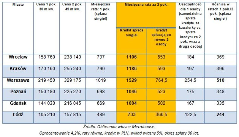 Samodzielny zakup mieszkania jednopokojowego jest najmniej opłacalną opcją w kontekście zaciągania kredytu hipotecznego. Z obliczeń Metrohouse wynika, że różnica pomiędzy miesięczną ratą kredytu zaciągniętego na zakup jednopokojowego mieszkania (30 m kw.) po średnich cenach rynkowych, a mieszkania dwupokojowego (45 m kw.) wynosi, w zależności od miasta, od 244 do 510 zł. Być może te niewielkie różnice sprawiają, że 28 proc. singli, którzy wstępnie deklarowali zakup kawalerki weryfikuje kierunek swoich poszukiwań i decyduje się na zakup większego mieszkania dwupokojowego.