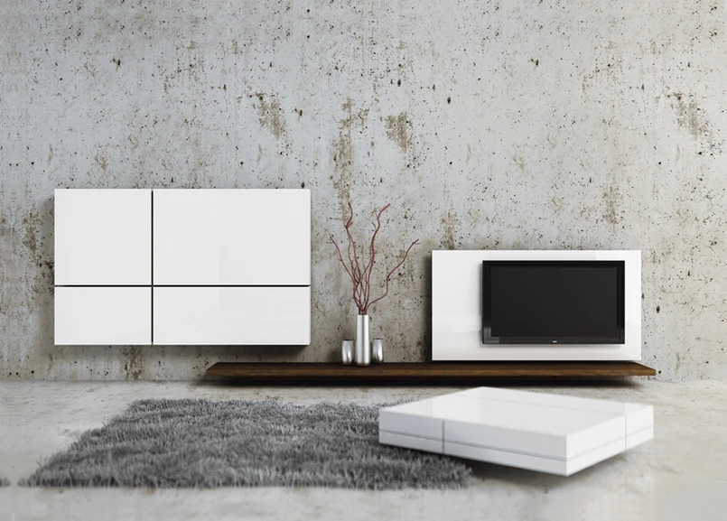 Meble lakierowane na błysk lub matowe w bieli możemy zaplanować również w salonie. W tym miejscu często koncentruje się życie domowników, więc nie należy go zagracać. Warto ograniczyć się do kilku obowiązkowych punktów, takich jak szafka RTV i stolik kawowy, uzupełnionych np. ciekawą i funkcjonalną komodą.