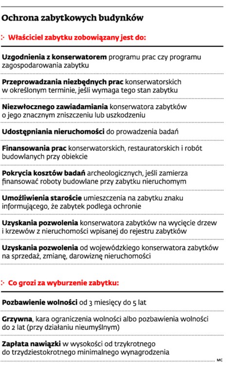 – Jedynie obiekty już wpisane do przedmiotowego rejestru podlegają ochronie prawnej i tylko w stosunku do nich dopuszczalne jest stosowanie instrumentów nadzoru konserwatorskiego o charakterze władczym – wyjaśnia Marlena Tomaszewska. Rozbiórka obiektu umieszczonego już w rejestrze zabytków pociąga więc za sobą znacznie dotkliwsze konsekwencje. Kto bowiem niszczy zabytek, podlega karze pozbawienia wolności od 3 miesięcy do 5 lat. Orzeczona wobec niego może zostać także nawiązka.