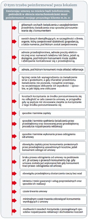 Obowiązki informacyjne przedsiębiorcy zawierającego umowy poza lokalem przedsiębiorstwa określa ustawa z 30 maja 2014 r. o prawach konsumenta (Dz.U. poz. 827; dalej: ustawa o prawach konsumenta). W niej zawarto katalog informacji, które najpóźniej w chwili wyrażenia przez konsumenta woli związania się umową na odległość lub poza lokalem przedsiębiorstwa przedsiębiorca ma obowiązek przekazać w sposób jasny, zrozumiały i, co ważne, na piśmie. Spełniając obowiązek informacyjny, przedsiębiorca powinien doręczyć również wzór formularza odstąpienia od umowy, zawarty w załączniku nr 2 do ustawy o prawach konsumenta (art. 12 ust. 1 pkt 9). Ponadto, pośrednik jest zobowiązany wydać konsumentowi dokument umowy zawartej poza lokalem przedsiębiorstwa lub potwierdzenie jej zawarcia, utrwalone na papierze lub, za zgodą konsumenta, na innym trwałym nośniku.