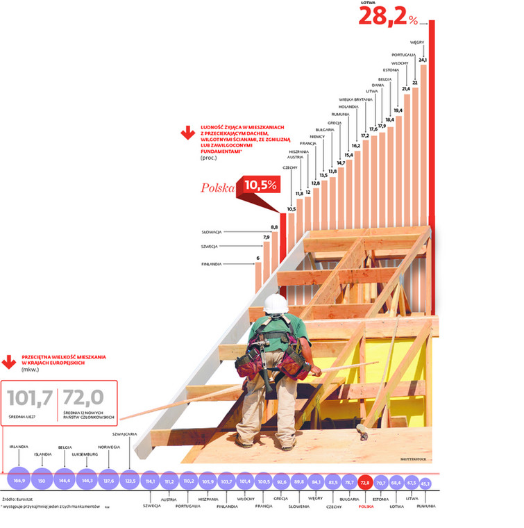 10,5 proc. mieszkańców naszego kraju mieszka w domach z przeciekającymi dachami lub wilgotnymi ścianami i podłogami albo z grzybem lub zawilgoconymi fundamentami – wynika z danych Eurostatu. Ale jak się okazuje, w takich warunkach mieszka więcej Niemców (13,5 proc.), Francuzów (12,8 proc.), mieszkańców Anglii (17,2 proc.), Portugalii (22 proc.) i na przykład Włoch (21,4 proc.).