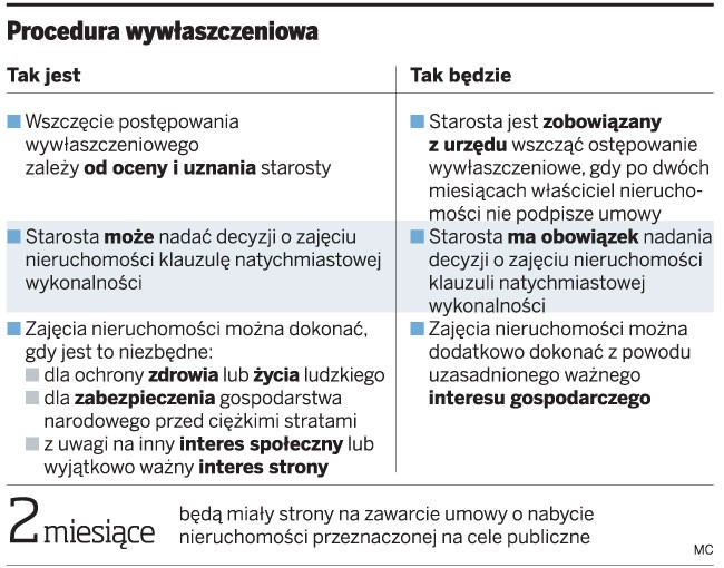 Zgodnie z projektem, starosta będzie zobowiązany do wszczęcia postępowania wywłaszczeniowego po upływie dwumiesięcznego terminu na zawarcie umowy o nabycie praw do nieruchomości. Obecnie decyzja ta zależy od jego uznania.