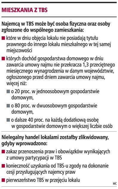 Najemcy zarabiają na handlu mieszkaniami w TBS-ach, mimo że jest on zakazany. Zdaniem rzecznika praw obywatelskich pozwalają na to nieprecyzyjne przepisy o formach popierania budownictwa. Ministerstwo Infrastruktury twierdzi, że wszystkiemu winne są TBS-y, które zawierają wadliwe umowy z partycypantami.