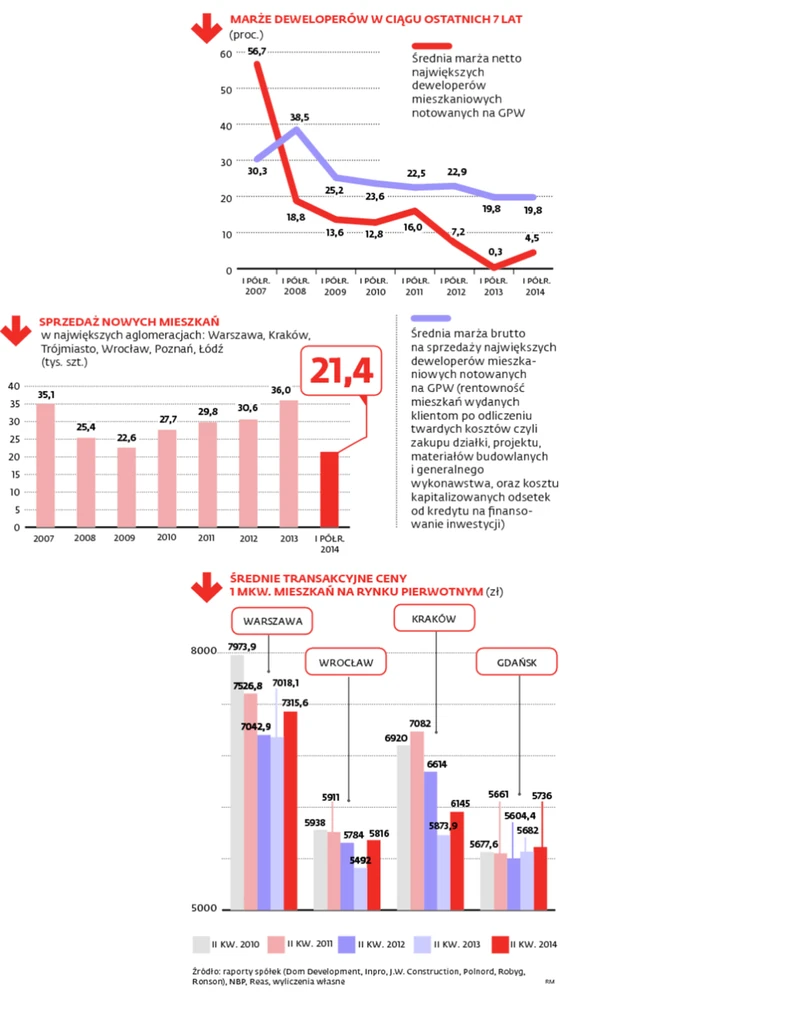 Szacuje on, że w 2014 r. średnia marża brutto dla sześciu znaczących na rynku i monitorowanych przez brokera spółek – Dom Development, LC Corp, Ronsona, Robyga, JWC i Polnordu – wyniesie ok. 20 proc., w 2015 r. wzrośnie średnio o ok. 2 pkt proc., a w 2016 r. wzrośnie o kolejne 1–2 pkt proc.