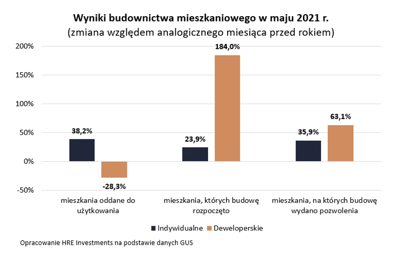 Budowę aż tylu nowych mieszkań zaczęli oni w samym tylko maju br. Jest to wynik niemal 3 razy wyższy niż w analogicznym okresie rok wcześniej. Tak wysoka dynamika jest więc po części efektem niskiej bazy. Chodzi po prostu o to, że w pierwszej fazie epidemii deweloperzy na dwa miesiące (kwiecień i maj) zahamowali nowe inwestycje. Jeśli więc porównujemy dobre dziś dane do tych sprzed roku, to otrzymujemy potężną dynamikę wzrostu.