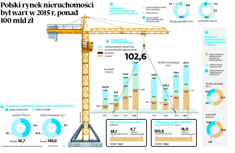 W 2015 r. w Polsce zarejestrowano ok. 412,5 tys. transakcji kupna/sprzedaży nieruchomości, których wartość osiągnęła 102,6 mld zł – podał Główny Urząd Statystyczny. To kwota aż o 35 proc. wyższa niż rok wcześniej. O 28 proc. wzrosła jednocześnie liczba transakcji.