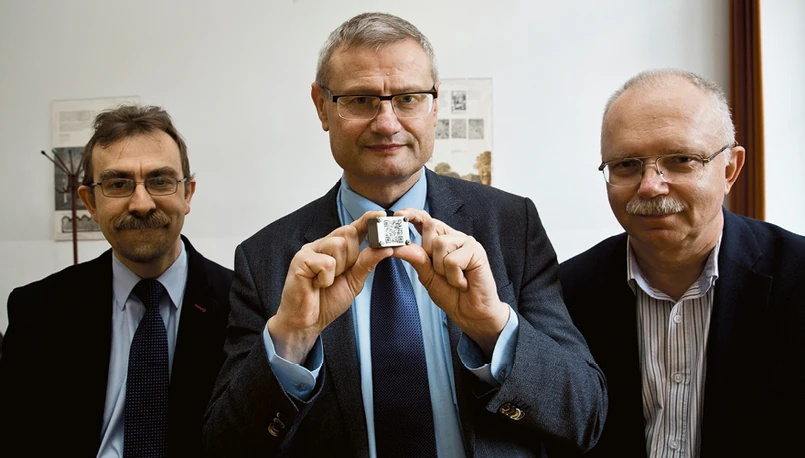 Jak zapisać ciąg zer i jedynek w metalu? Zaprzęgając do tego laser, który punktowo będzie topił materiał – co będzie można później odczytać jako jedynki. Jak tłumaczy dr hab. inż. Sławomir Wronka, chociaż fizyczna reprezentacja danych będzie przypominała kod binarny, to w rzeczywistości może to być coś innego. – Na przykład zapis przypominający obecnie stosowane fotokody. Dodatkowa zaleta takiego rozwiązania jest taka, że dane przed zapisem są kompresowane, a więc można pomieścić ich więcej – tłumaczy naukowiec. Nawet długotrwała pamięć powinna być poręczna, dlatego naukowcy postulują dwie formy, które mógłby przyjąć ich nośnik. Pierwsza to metalowa taśma, która po zapisie byłaby zwijana w szpulę. Druga to cienkie, metalowe płytki, które po naniesieniu danych byłyby przechowywane jedna na drugiej – w kostkach (na zdjęciu widać model w powiększeniu).