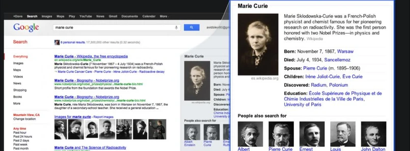 Druga z nowości to pokazywanie najważniejszych informacji dotyczących szukanego zapytania. Jeśli poszukujemy informacji o Marii Skłodowskiej-Curie, to wpisując taką frazę w wyszukiwarkę otrzymamy np. listę jej dokonań czy najważniejszych dat z jej życia. Dodatkowo Knowledge Graph będzie pomagał nam zrozumieć relacje między rzeczami. Szukając informacji o Skłodowskie-Curie dostaniemy też informacje o jej mężu czy dzieciach.