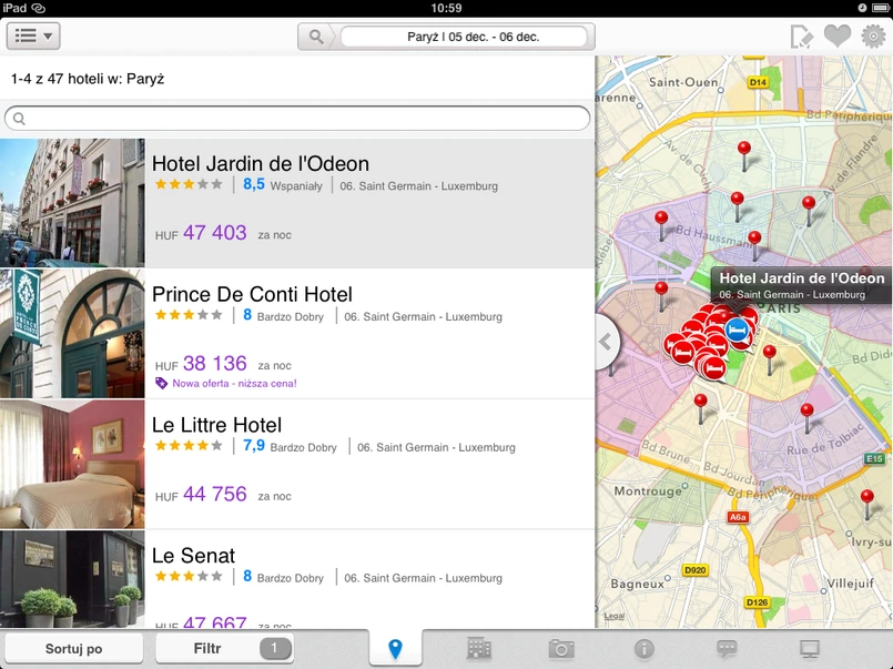 Nowa aplikacja na iPada w pełni wykorzystuje większy ekran urządzenia i różni się w kilku zasadniczych kwestiach od wersji na iPhona. Pierwsza z nich to zdecydowanie łatwiejsze i bardziej intuicyjne poruszanie się po mapie, oraz możliwość przyjrzenia się danej lokalizacji z szerszej perspektywy. Inne zalety aplikacji to możliwość przeglądania hoteli według popularności danej lokalizacji, wyszukiwanie hoteli w pobliżu obecnej lokalizacji użytkownika, zapisywanie listy ulubionych hoteli, oraz jeszcze łatwiejsze przeglądanie zdjęć, recenzji oraz informacji o hotelach za pomocą jednego ruchu palcem.