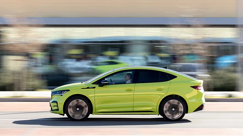 Wnętrze również zaskakuje udogodnieniami. Przytulnie wykończone miejsce kierowcy rozpieszcza ergonomią uzupełnioną dodatkami premium. Standard to 13-calowy centralny ekran intuicyjnie rozbudowanej stacji multimedialnej i 5,3-calowy cyfrowy kokpit. Komfort prowadzenia podnosi wyświetlacz head-up z rozszerzoną rzeczywistością, wówczas wskazówki nawigacji są nakładane na widok drogi za szybą. Sprawdzają się super! Poza tym wszystkie wersje wyposażono w dwustrefową klimatyzację Climatronic czy wielofunkcyjną kierownicę z manetkami do regulacji stopnia rekuperacji. Mimo wcześniej opadającego dachu przestronność kabiny jest bardziej niż satysfakcjonująca. Z tyłu prześwit między głową pasażera a sufitem dorównuje temu w Octavii kombi – miejsca z powodzeniem wystarczy osobom o wzroście ok. 190 cm. Przyczynia się do tego seryjny panoramiczny czarny szklany dach. Bagażnik eleganckiego coupe również nie zmusza do wyrzeczeń – zapewnia 570 l pojemności wobec 585 l, które oferuje klasyczny Enyaq. Funkcjonalność podnoszą schowki, pojemnik na przewody oraz solidne haki na torby z zakupami.