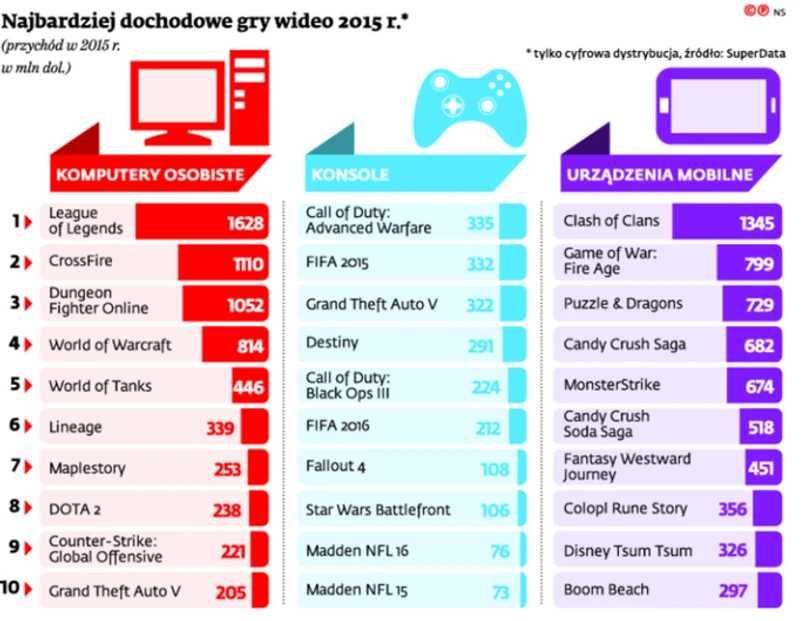 sprzedaż pudełkowa spada. Z wyliczeń Superdata wynika, że wartość rynku gier mobilnych i darmowych z mikropłatnościami przekracza 30 mld dol. Cyfrowe gry na PC i konsole to ponad 10 mld dol. Wielkie studia także chcą uszczknąć coś dla siebie. Koncern Activision po udanym eksperymencie z miesięcznym abonamentem w „World of Warcraft” za 6 mld dol. kupił producenta gry mobilnej F2P „Candy Crash Saga”. Nintendo zapowiedziało, że zaszyje mikropłatności w swojej pierwszej grze na urządzenia mobilne.