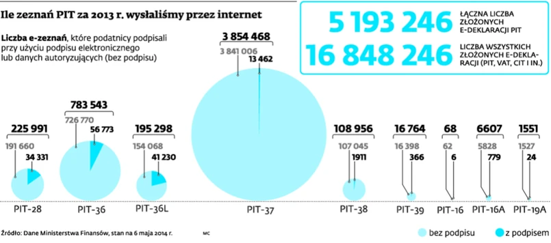 5,2 mln zeznań przesłanych przez internet i wyraźny spadek kwoty odliczeń z tytułu ulg prorodzinnej i internetowej – to wyniki wstępnego podsumowania rocznych PIT za 2013 r.