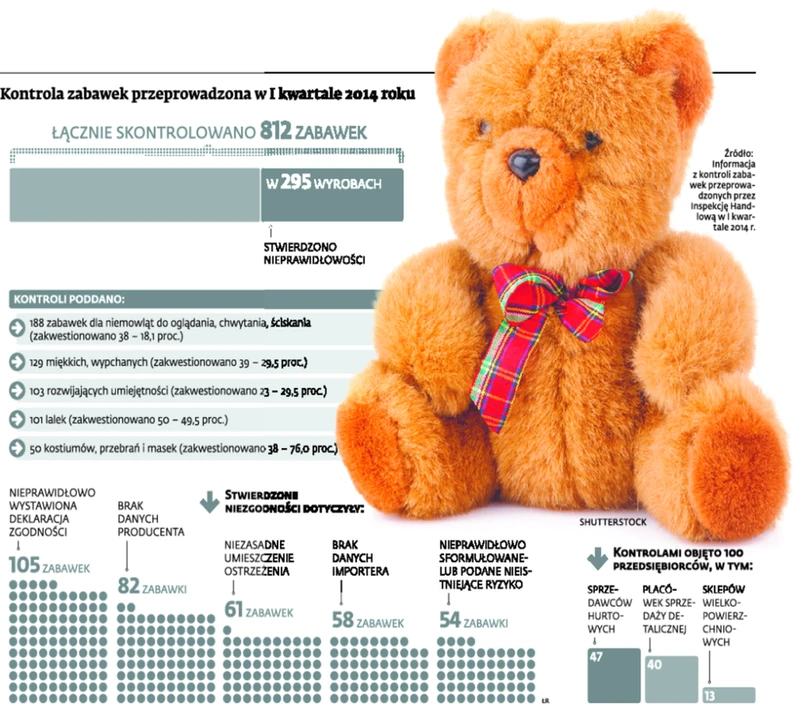 W minionych miesiącach sprawdzeniu pod kątem podstawowych wymogów (np. informacyjnych) poddano 812 zabawek. Najwięcej nieprawidłowości stwierdzono u tych, które pochodziły spoza Unii Europejskiej (76,6 proc. skontrolowanych) oraz tych, które zostały wyprodukowane w Polsce (18,1 proc.). Dokładniejszej kontroli laboratoryjnej pod kątem ewentualnego niebezpieczeństwa dla dziecka poddano 144 produkty. Ryzyko stwierdzono w 25 spośród nich.