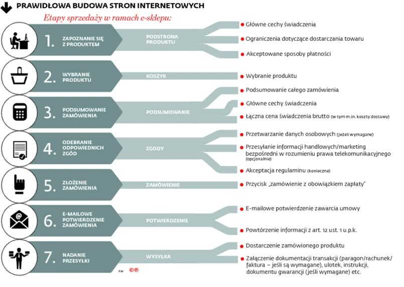 Przedstawiamy uproszczony schemat wzorowej ścieżki zakupowej, którą podąża klient robiący zakupy w e-sklepie. Wskazujemy przy tym, jakie elementy powinna ona zawierać, aby odpowiadała obecnym wymogom prawnym. Podzieliliśmy ją na kilka etapów. Można potraktować ten wzór jako pewnego rodzaju ściągawkę, pomagającą wychwycić ewentualne braki w stronie każdego sklepu.