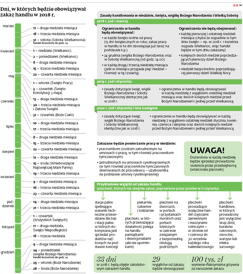 Uchwalony przez Sejm zakaz handlu w niedziele ma być jak najmniej dotkliwy dla konsumentów, a jednocześnie zaspokoić żądania związków zawodowych i pracowników branży. Temu mają służyć ostatnie poprawki wprowadzone do projektu przez posłów PiS. Rząd ugiął się pod presją związkowców i zgodził na stopniowe zaostrzanie zakazu. W 2020 r. ma on obejmować wszystkie niedziele z kilkoma wyjątkami w ciągu roku. Ale zanim się to stanie, konsumenci zyskają czas, by się do ograniczeń przyzwyczaić. Dlatego w 2018 r. (od marca) handel będzie dozwolony w dwie niedziele w miesiącu (pierwszą i ostatnią), a w 2019 r. – w jedną (ostatnią). Najmniej czasu na dostosowanie się do zmian mają pracodawcy – w ciągu niecałych trzech miesięcy od przyjęcia ustawy będą musieli przemodelować systemy pracy oraz terminarze dostaw.