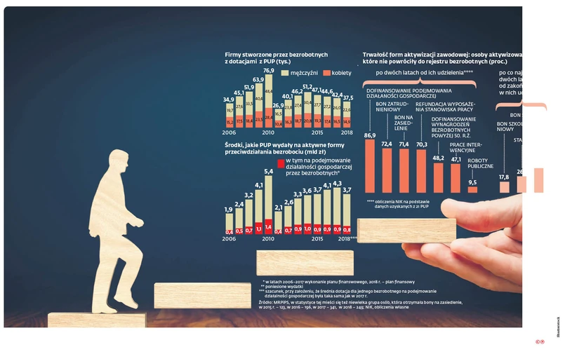 Urzędy pracy miały na ten cel wystarczające środki, mimo że na aktywne formy przeciwdziałania bezrobociu PUP otrzymały 3,7 mld zł – o 0,6 mld zł mniej niż rok wcześniej. Nie ma jeszcze oficjalnych danych, ale z tej kwoty na podejmowanie działalności gospodarczej wydały ponad 761 mln zł – o około 100 mln zł mniej niż w 2017 r. Okazuje się, że właśnie aktywizacja bezrobotnych w formie jednorazowych dotacji na działalność gospodarczą charakteryzuje się największą trwałością – tę kwestię zbadała NIK. Spośród osób, które otrzymały takie dotacje, aż 87 proc. nie powróciło do rejestru bezrobotnych przez co najmniej dwa lata od ich otrzymania.