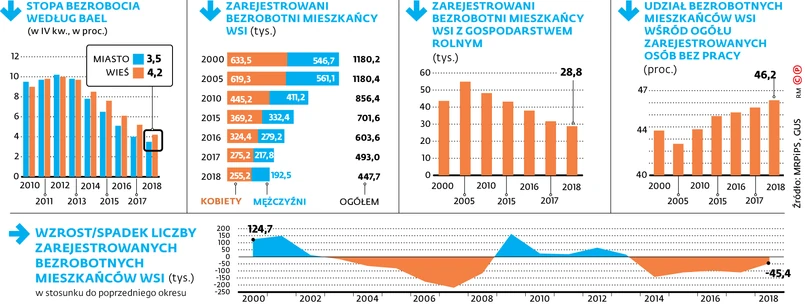 To oznacza, że liczba zarejestrowanych bezrobotnych kurczyła się na wsi wolniej niż w miastach. Potwierdza to statystyka. Według niej w końcu grudnia w urzędach pracy zarejestrowanych było 447,7 tys. bezrobotnych mieszkańców wsi – o 9,2 proc. mniej niż przed rokiem. Natomiast liczba zarejestrowanych osób bez zajęcia w miastach zmniejszyła się w tym czasie o 11,5 proc.