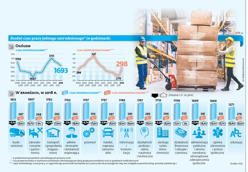 1693 godziny – tyle przepracowała statystycznie w 2018 r. osoba zatrudniona w firmie lub instytucji mającej ponad dziewięciu pracowników. Było to o 0,4 proc. mniej niż w roku poprzednim, przy tej samej liczbie 250 dni roboczych – wynika z najnowszych danych GUS.