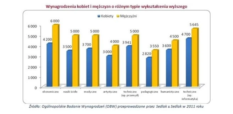 Największe różnice pomiędzy zarobkami kobiet i mężczyzn wystąpiły w grupie osób z wykształceniem wyższym ekonomicznym. Mężczyźni o takim wykształceniu zarabiali 6 000 zł i było to o 43 proc. więcej niż kobiety z ukończonymi studiami ekonomicznymi (mediana 4 200 zł). Dla porównania, w grupie osób z wykształceniem humanistycznym, kobiety otrzymywały pensje w wysokości 3 600 zł (mediana), co stanowiło 80 proc. zarobków uzyskiwanych przez mężczyzn z takim wykształceniem (mediana 4 500 zł).