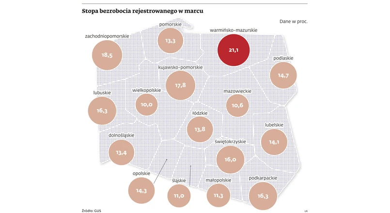 Z danych GUS wynika również, że w porównaniu z marcem ubiegłego roku bezrobocie zwiększyło się w ośmiu województwach – najbardziej w łódzkim (o 4,8 proc.), małopolskim (o 2,4 proc.), mazowieckim (o 1,8 proc.), śląskim (o 1,7 proc.) oraz podkarpackim i podlaskim (po 0,9 proc.). Z kolei w województwie lubelskim liczba bezrobotnych się nie zmieniła. A w siedmiu pozostałych województwach spadła – na przykład w dolnośląskim (o 3,6 proc.), zachodniopomorskim (o 2,7 proc.) i warmińsko-mazurskim (o 1,6 proc.).