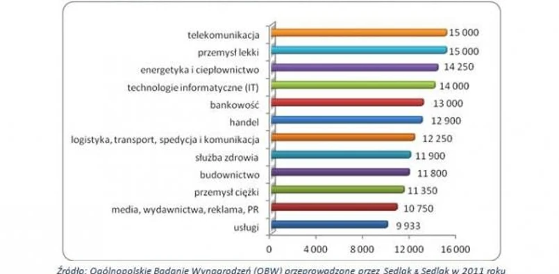 Wśród osób posiadających dyplom Master of Business Administration, najlepiej zarabiali pracownicy zatrudnieni w branży telekomunikacyjnej i przemyśle lekkim - mediana ich zarobków kształtowała się na poziomie 15 000 zł. O 750 zł mniej otrzymywały osoby pracujące w energetyce i ciepłownictwie, natomiast płace pracowników zatrudnionych w IT sięgały 14 000 zł. Najniższe wynagrodzenia otrzymywali pracownicy branży usługowej oraz grupy: media, wydawnictwa, reklama i PR. Otrzymywali oni odpowiednio 9 933 zł i 10 075 zł.