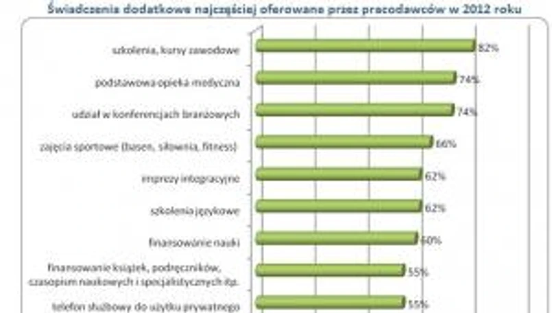 Wśród popularnych świadczeń znajdują się również: podstawowa opieka medyczna (74 proc.), udział w konferencjach branżowych (74 proc.) oraz zajęcia sportowe (66 proc.). Mniejszym powodzeniem cieszą się zapomogi w przypadkach losowych (54 proc.), jak również telefon służbowy do użytku prywatnego oraz finansowanie przez przedsiębiorstwo książek czy czasopism naukowych (kolejno 55 proc.).