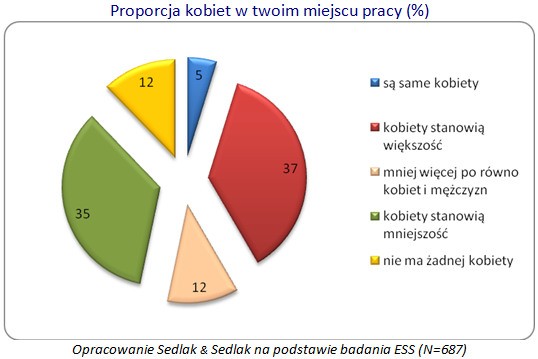 Podobna kwestia została zbadana w Europejskim Sondażu Społecznym w 2010 roku. Zadano wówczas respondentom pytanie: jaki jest odsetek kobiet w twoim miejscu pracy? Dane ESS dla Polski ukazują, że aż 47% ankietowanych uważa, że kobiet jest mniej niż mężczyzn w ich miejscu pracy. Natomiast 42% ankietowanych Polaków uznało, iż kobiety stanowią większość w miejscu pracy.