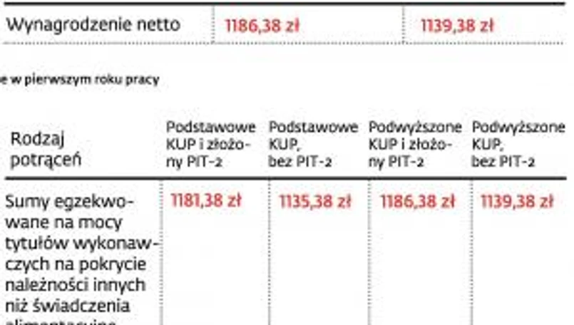 Wartość netto wynagrodzenia nie będzie jednakowa dla wszystkich otrzymujących najniższą pensję. Różnice wynikają z kosztów uzyskania przychodów (KUP), jakie należy zastosować w przypadku konkretnego pracownika. Ważne jest także to, czy zatrudniony złożył PIT-2, czy nie (patrz tabela).