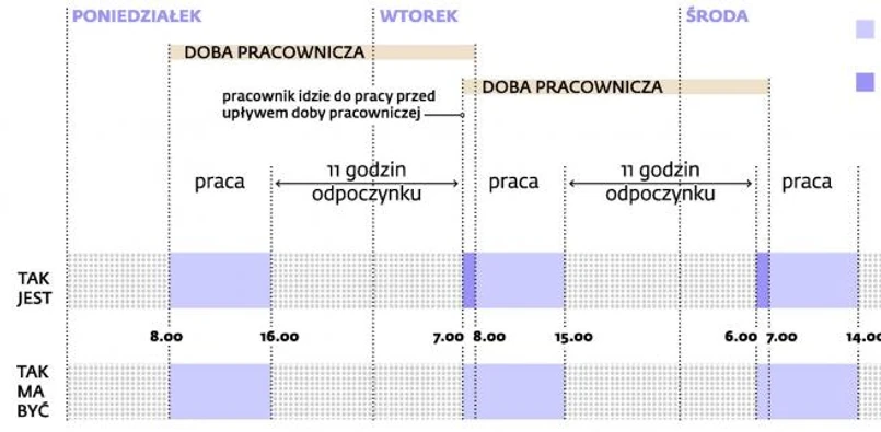 Jego zdaniem będzie tak w sytuacji, kiedy pracownik pracujący w systemie 8-godzinnym np. w poniedziałek rozpocznie pracę o godzinie 8.30, jego doba rozliczeniowa zakończy się we wtorek o 8.30 i o tej godzinie rozpocznie się dzień wolny. Jeżeli podwładny w środę rozpocznie wykonywanie obowiązków o 7.30, to przez godzinę będzie je świadczyć w dniu wolnym. Pracodawca będzie musiał oddać cały dzień w innym terminie.