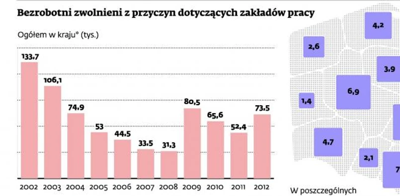 Zwolnienia grupowe zapowiedziały m.in. banki (5 tys. osób), Fiat Auto Poland (1,5 tys.) i Poczta Polska (5 tys.). Bez redukcji nie obejdzie się też w PKP i w dużych firmach energetycznych. Zwolnienia uderzą nie tylko w szeregowych pracowników, lecz także w specjalistów i menedżerów średniego i wyższego szczebla. – W firmach coraz powszechniejsze staje się łączenie kilku kierowniczych funkcji, więc dziś nawet wysokie kwalifikacje nie chronią przed utratą pracy – twierdzi Artur Ragan z agencji Work Express.