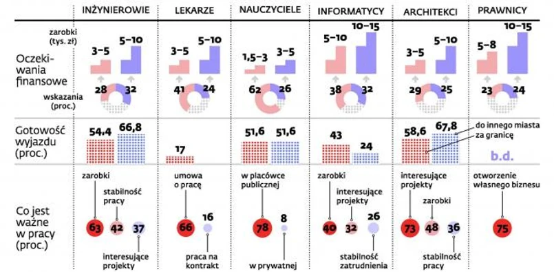 Także informatycy, choć mają bardzo dobrą sytuację w Polsce – około 40 proc. z nich deklaruje, że mogłoby wyjechać. Jednak najchętniej za granicę do ciekawych projektów w dużych, dających szansę rozwoju firmach. Co ciekawe, mniej chętni do wyjazdu są lekarze – tylko co szósty rozważa emigrację. I to najczęściej po zrobieniu specjalizacji. Wtedy wiedzą, że mogą liczyć na dobre zarobki.