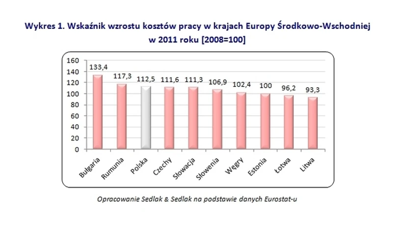 Wynagrodzenia oraz pozapłacowe koszty pracy w Bułgarii w latach 2008-2011 zwiększyły się o 33,4%. Stosunkowo duży przyrost kosztów zatrudnienia miał miejsce również w Rumunii (+17,3%), Polsce (+12,5%) oraz Czechach (+11,6).