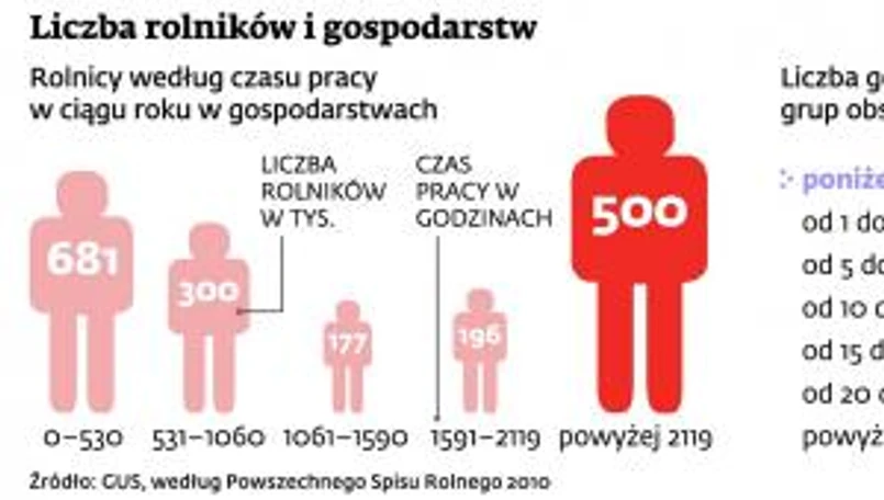 Co ważne, jeśli przeliczy się pracę wykonywaną przez rolników na pełne etaty (pełny etat to 2120 godzin pracy w roku przez 265 dni roboczych po 8 godzin dziennie), wtedy wystarczyłoby ich tylko dla 980 tys. spośród około 1,9 mln zatrudnionych w gospodarstwach indywidualnych. A to oznacza, że jest w nich aż 900 tys. zbędnych osób, bez których produkcja rolna by nie spadła. Jeśli jednak wyeliminuje się z tego rachunku gospodarstwa do 1 ha, wtedy takich osób będzie 600 tys.