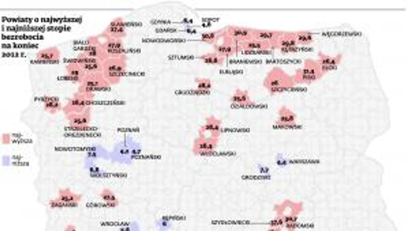 Z danych GUS wynika, że powiaty z 20-proc. bezrobociem na stałe wpisały się w krajobraz kraju. Eksperci twierdzą, że ten krajobraz od wielu lat się nie zmienia z kilku powodów, m.in. dlatego że istnieją obszary, na których brakuje inwestycji nawet przy dobrej koniunkturze gospodarczej. A to ze względu na zły stan infrastruktury. – Występuje tam też zjawisko samonapędzającego się mechanizmu, który utrwala bezrobocie – uważa prof. Zenon Wiśniewski z Uniwersytetu Mikołaja Kopernika w Toruniu. Wyjaśnia, że w powiatach, w których dużo osób nie ma pracy, automatycznie nie ma dochodów. W efekcie jest tam też niski popyt na towary i usługi. Siłą rzeczy nie powstają nawet niewielkie firmy – miałyby po prostu zbyt mało klientów, aby biznes się opłacał.