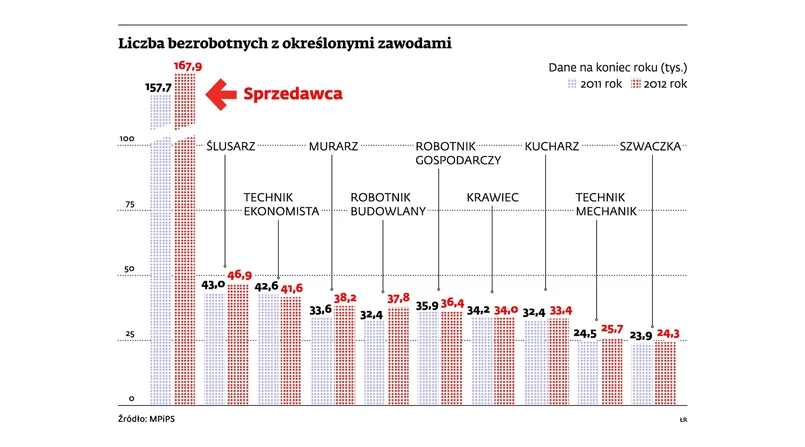 Z danych resortu pracy wynika również, że na czele rankingu zawodów, z którymi wiąże się bezrobocie, znajdują się profesje wymagające niskich kwalifikacji. Jednak wśród nowo zarejestrowanych osób bez zajęcia już na 17. miejscu znajdują się ekonomiści z wyższym wykształceniem, a na 18. pozycji są pedagodzy. Ale prawda jest taka, że w kryzysie bezrobotnym można stać się, mając każdy zawód.
