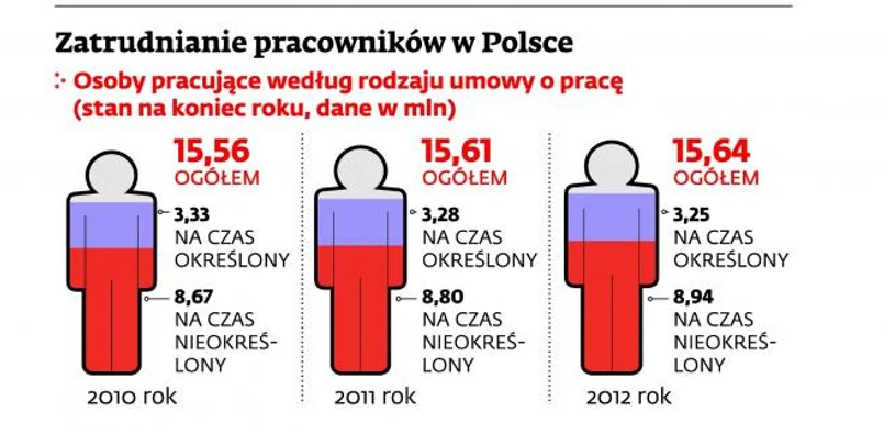 Nie przeszkadza im w tym ani kryzys gospodarczy, ani podwyżka kosztów pracy (składki rentowej), ani nawet przywileje i lepsze gwarancje zatrudnienia, jakie zyskują podwładni. Z danych GUS wynika, że w ciągu trzech ostatnich lat liczba umów na czas nieokreślony wzrosła o ponad 270 tys. (w IV kw. 2012 r. było ich w sumie 8,94 mln), a tych terminowych spadła o ponad 80 tys. (w sumie w IV kw. 2012 r. – 3,25 mln).