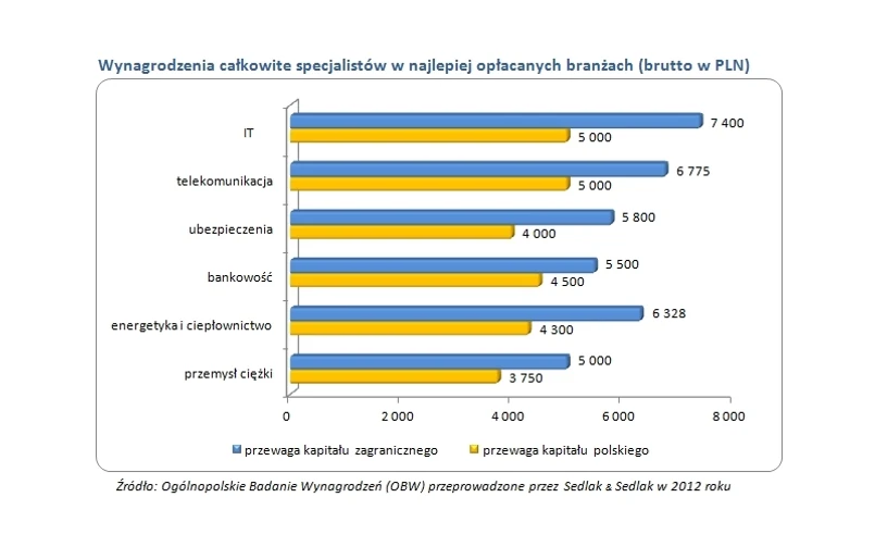 Wśród sześciu najlepiej opłacanych branż znalazły się między innymi takie obszary jak IT, ubezpieczenia oraz przemysł ciężki. Istniały tam jednak dość duże dysproporcje pomiędzy stawkami wynagrodzeń oferowanymi przez firmy o odmiennym pochodzeniem kapitału. Przykładowo mediana płac pracowników telekomunikacji w polskich organizacjach wyniosła 5 000 PLN i była o ponad 26% niższa niż odnotowana w przedsiębiorstwach zagranicznych (6 775 PLN).