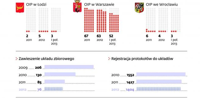 Spadek zainteresowania dialogiem społecznym w firmach potwierdzają dane PIP. W 2012 r. inspekcja zanotowała tylko 76 informacji o zawieszeniu stosowania zakładowych układów z powodu trudności finansowych pracodawcy.