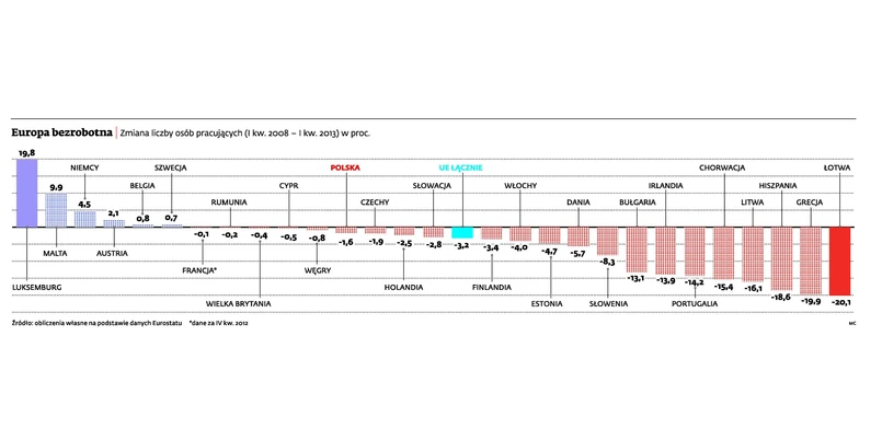Na drugim biegunie znalazły się Niemcy (pomijamy tu niewielkie rynki Luksemburga i Malty). To kolejny dowód na to, że kryzys strefy euro i wymuszone cięcia na europejskim Południu dla niemieckiej gospodarki okazały się w pewnym aspekcie korzystne. Dzięki wzrostowi konkurencyjności wywołanemu spadkiem wartości euro Berlin wyeksportował własne bezrobocie za granicę.