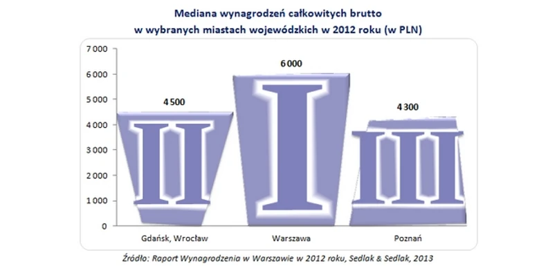 Jak wynika z raportu „Wynagrodzenia w Warszawie w 2012 roku”, mediana płacy całkowitej brutto w stolicy kraju była najwyższa, wynosiła 6 000 PLN. Na drugim miejscu w rankingu wysokości wynagrodzeń w miastach wojewódzkich uplasowały się Gdańsk i Wrocław. Jednakże zarobki w tych miastach były aż o 1 500 PLN niższe niż w Warszawie. Na trzecim miejscu znalazł się Poznań. Przeciętne wynagrodzenie w stolicy wielkopolski wyniosło w 2012 roku 4 300 PLN.