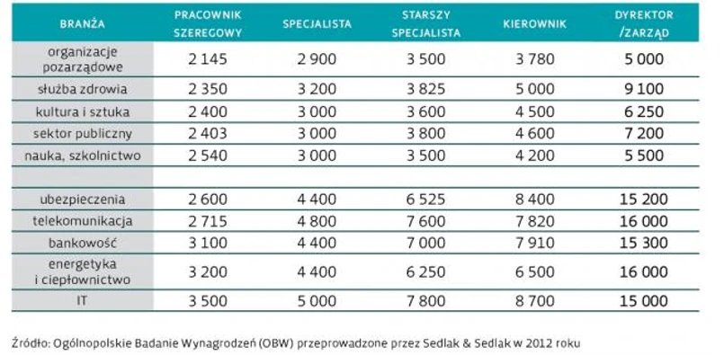 Biorąc pod uwagę średnie zarobki na szeregowych stanowiskach, najwyższe wynagrodzenia w 2012 roku odnotowano w branży IT oraz telekomunikacji. Według danych OBW mediany miesięcznych wynagrodzeń brutto wyniosły odpowiednio 6 tys. i 5,8 tys. PLN brutto. Płace w tej branży są dość zróżnicowane i zależą od wielkości firmy oraz regionu, w którym jest ona ulokowana. Płace powyżej 5 tys. PLN odnotowano również w branży finansowej. Najmniej zarabiają natomiast zatrudnieni w służbie zdrowia, administracji, kulturze i nauce oraz sektorze organizacji pozarządowych. Mediana wynagrodzeń w sektorze publicznym wyniosła 3 tys. PLN.
