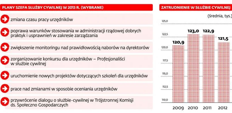 Sławomir Brodziński, szef służby cywilnej, nie zabiega już o odmrożenie płac w administracji rządowej. W swoim sprawozdaniu za 2012 r. podkreśla tylko, że trzeba się zająć rozpowszechnieniem dobrych praktyk w zakresie wykorzystywania zmiennych składników wynagradzania. Dotyczy to m.in. nagród za szczególne osiągnięcia w pracy zawodowej i dodatków zadaniowych. DGP przyjrzał się więc strukturze zatrudnienia i wynagrodzenia departamentu służby cywilnej w Kancelarii Prezesa Rady Ministrów, który zajmuje się jego obsługą.