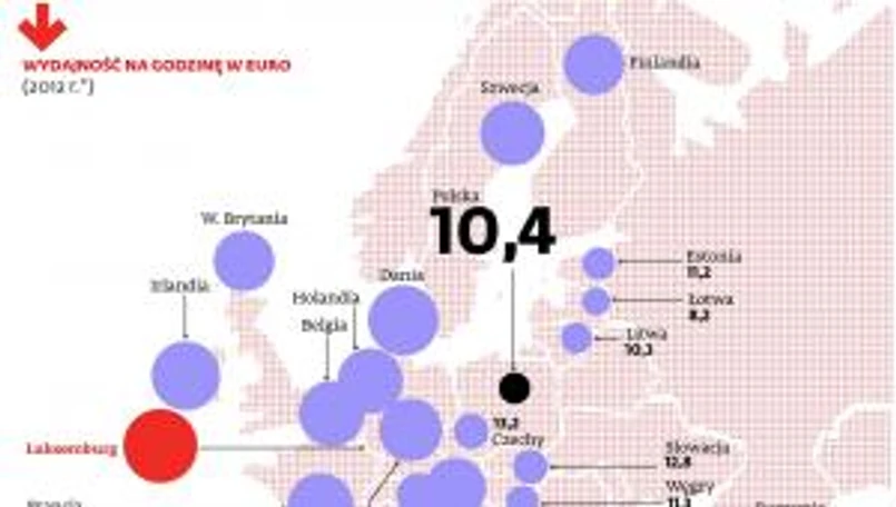 Najmniej pracuje się w Europie Zachodniej. Statystyczny Niemiec spędza w pracy ponad 500 godzin mniej niż Polak, ale każda godzina pracy nad Renem wytwarza towary i usługi o cztery razy większej wartości niż godzina pracy nad Wisłą. To ostatnie porównanie pokazuje, że statystycznie im bogatszy kraj, tym mniej się tam pracuje. Także wzrost bogactwa powoduje, że przeciętny czas pracy spada. Widać to dokładnie, jeśli porówna się przeciętny czas pracy w danym kraju obecnie i dekadę temu. W ciągu 12 lat przeciętny Polak zaoszczędził prawie 60 godzin. To i tak nic w porównaniu do innych krajów europejskich, gdzie wskaźnik ten spadł jeszcze bardziej. Czesi pracują o 100 godzin mniej, a Węgrzy o 145 mniej. Czas pracy spada także w krajach wysoko rozwiniętych. Niemcy przez dekadę zdążyli zaoszczędzić 74 godziny, nawet Norwegom udało się skrócić czas pracy o 35 godzin.