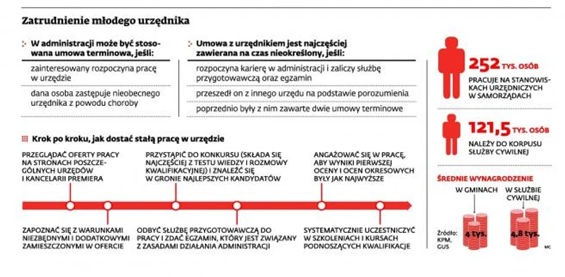 Podobne problemy nie występują poza korpusem służby cywilnej. W ustawie o pracownikach urzędów państwowych (t.j. Dz.U. z 2013 r., poz. 269) nie ma żadnych specjalnych przepisów, które przesądzałyby o terminie zatrudnienia. Z kolei w ustawie z 21 listopada 2008 r. o pracownikach samorządowych (Dz.U. nr 223, poz. 1458 z późn. zm.) również obowiązuje służba przygotowawcza i egzamin dla nowych pracowników. Ale przepisy nie wskazują, że bezpośredni przełożony wnioskuje wówczas o zawarcie z taką osobą stałej umowy.