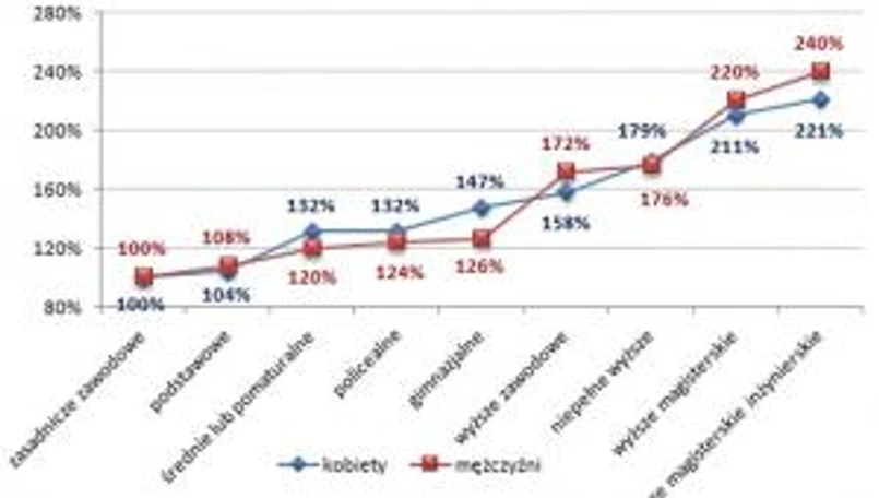 Krzywa przedstawiająca wynagrodzenia kobiet o różnym wykształceniu jest bardziej płaska, niż ta dotycząca mężczyzn. Oznacza to, że zarobki kobiet są mniej zróżnicowane niż mężczyzn. Kobieta z dyplomem magistra zarabiała w 2012 roku przeciętnie 2,11 razy więcej niż kobieta z wykształceniem zasadniczym zawodowym. W przypadku mężczyzn wskaźnik ten wyniósł 2,20.